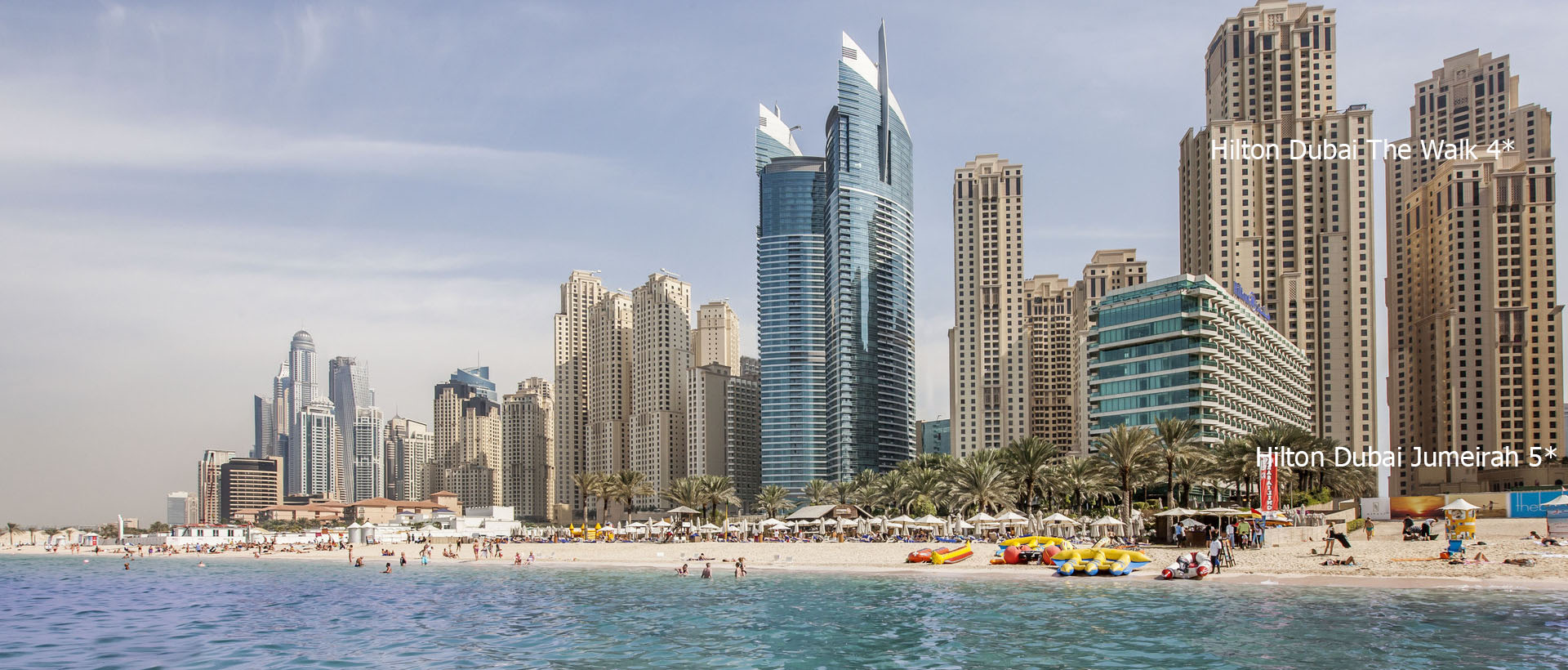 В центре известного променада JBR Walk, рядом с набережной Дубай Марины ждёт своих гостей отель Hilton Dubai Jumeirah Beach Resort 5* – один из немногих в этом районе отель на первой линии с собственным пляжем и большой территорией. Это главное здание, оно соединено мостиком с отелем той же сети Хилтон, только категории 4*, с номерами квартирного типа (апартаментами) - Hilton Dubai The Walk. Так как это отели одной сети, то пользоваться можно всеми услугами, что предлагают оба отеля – ресторанами и барами, удобно позаниматься фитнесом в современном, полностью оборудованном тренажёрном зале, отдохнуть у живописного бассейна, сводить ребёнка в детский клуб Kidz Pardise. Подростки могут провести досуг в игровой комнате с компьютерными играми, взрослые расслабиться в роскошном SPA – салоне, на пляже позаниматься водными видами спорта.